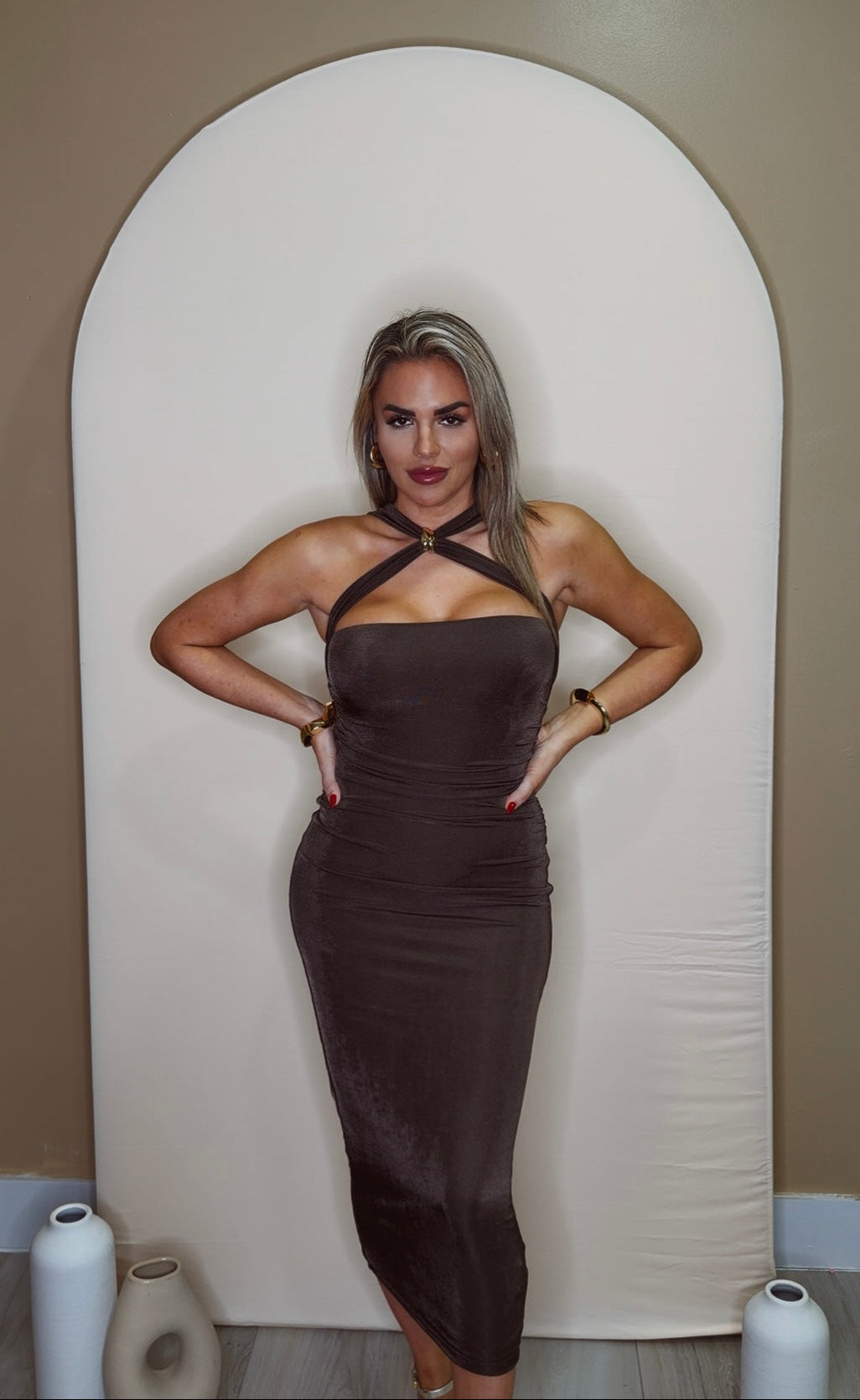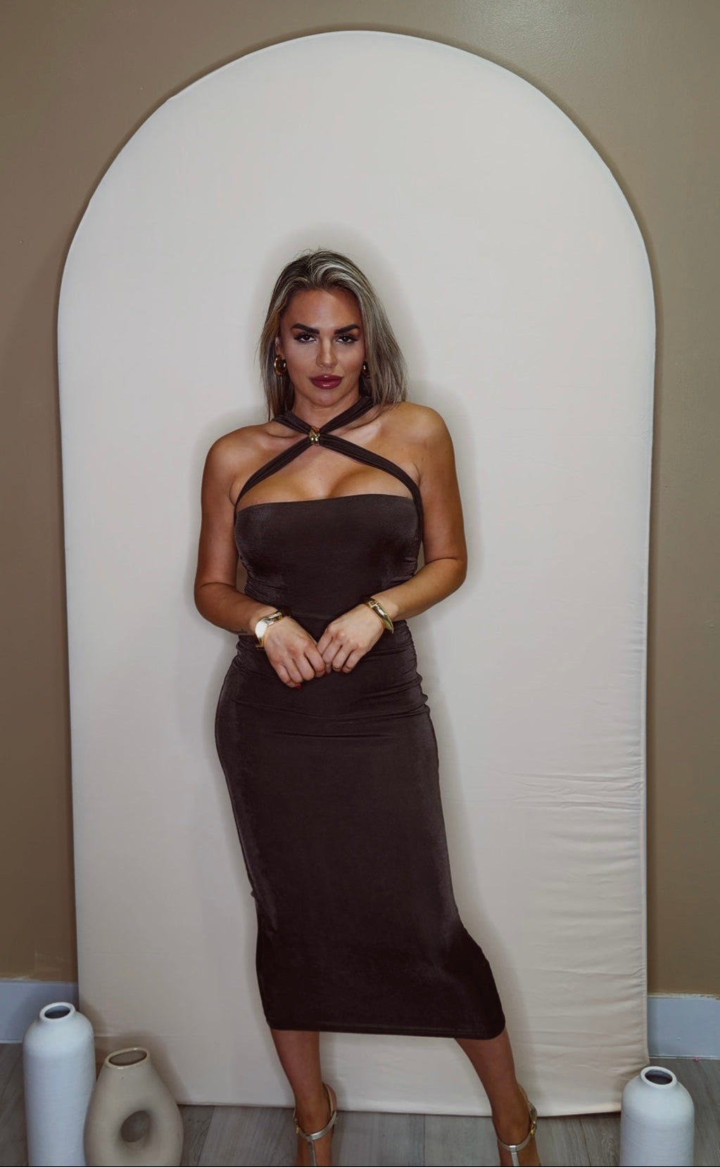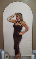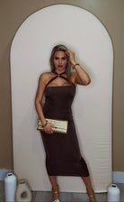 Bodycon midi dress with cross neck and gold buckle detail; has stretch and slim fit material in Chocolate Brown
