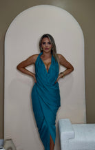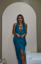Beaded accent drape cowl neck, ruched midi dress. Loose fit
